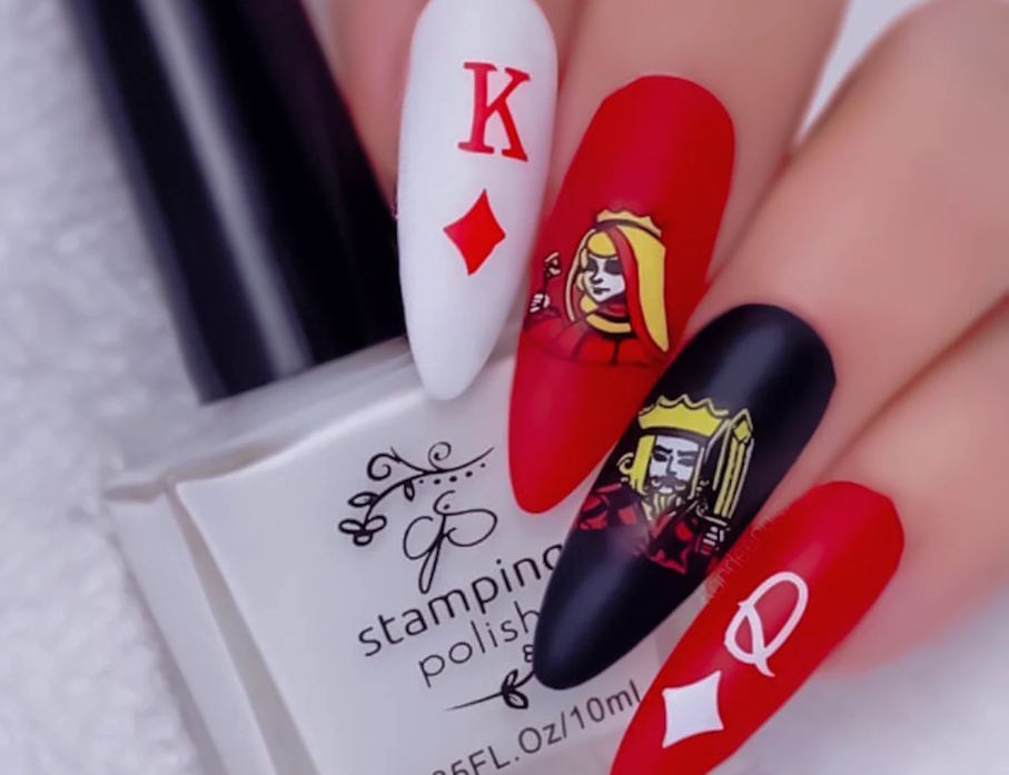 Un consejo: combina técnicas para que tu manicure no se vea monótona. Por ejemplo, un dado en relieve en la uña del anular y cartas pintadas en las demás uñas crean un contraste elegante y divertido.
